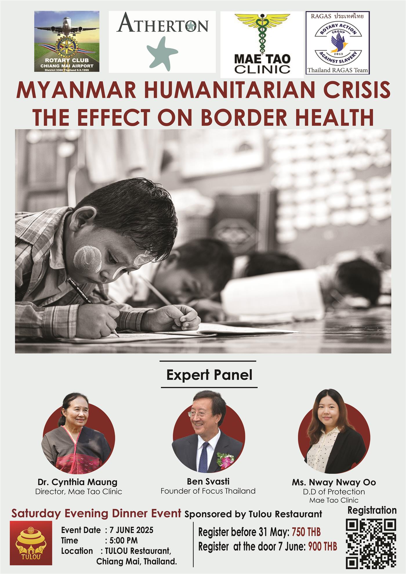 TRAGAST and the Chiang Mai Airport Rotary Club (CMARC) invite to to attend a panel discussion about the humanitarian crisis in Myanmar and how it is affecting border health and children on Saturday 7 June 2025. Seating is limited. Reserve your seat today - email to info@tragast.org Details: